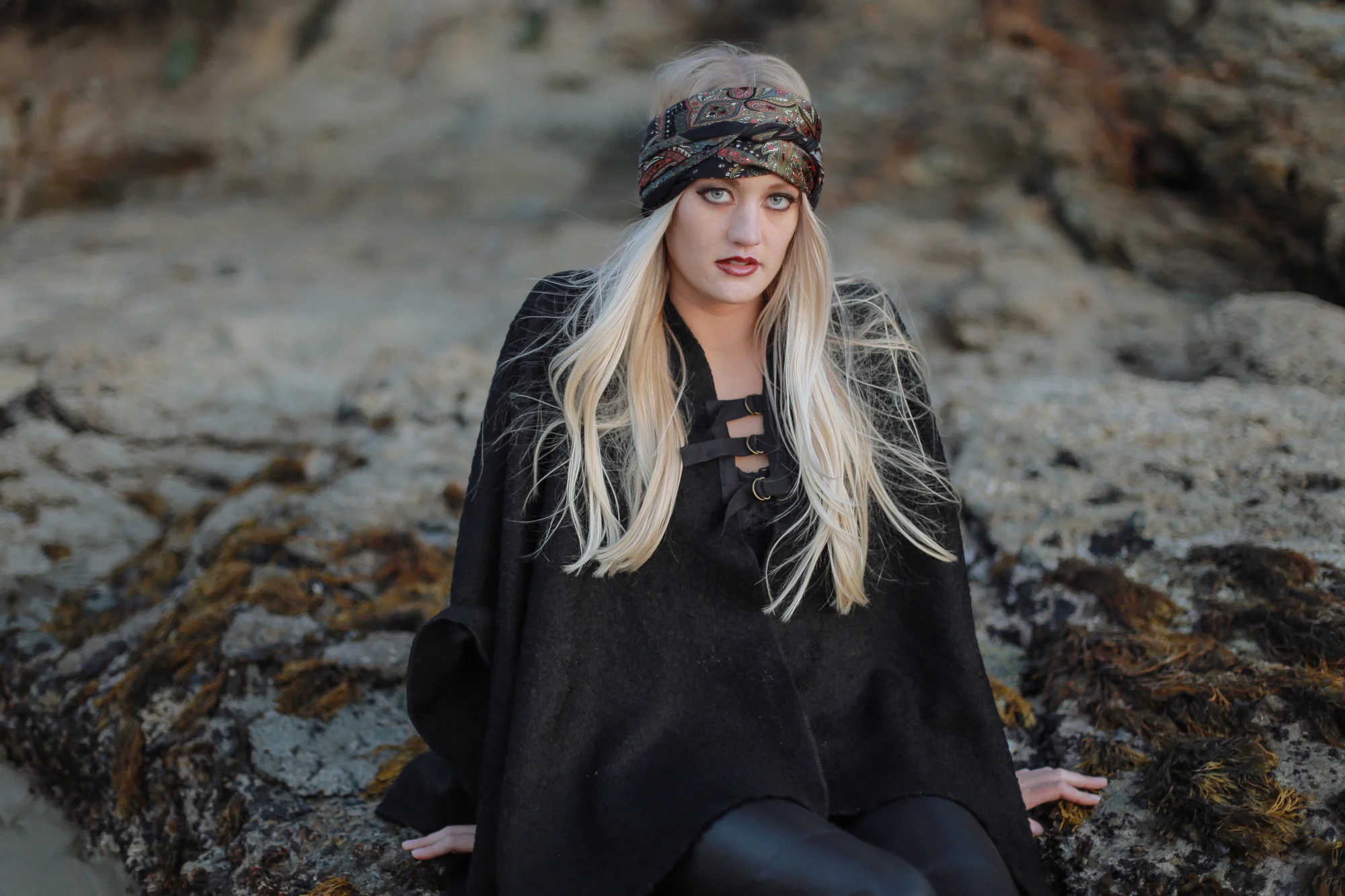 Italian wool to stay warm? Say no more, the Revolt poncho does just that while flaunting that cool, edgy look. Features three closures at the front.